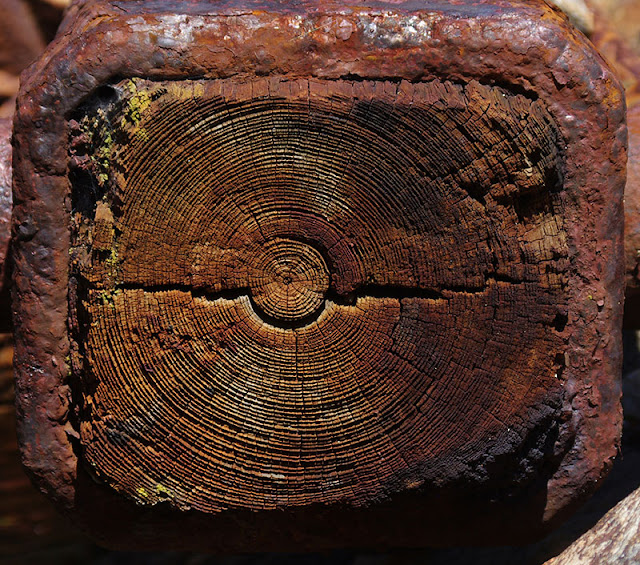 Okay, not stricly a fencepost. This is part of the frame of a marble cutting machine from the small marble quarry at the southern end of Iona. The quarry was never very successful and has not been worked since World War I