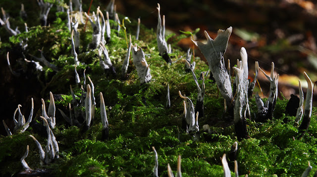The candle snuff fungus, when mature, can look rather like the whisps of smoke coming off the wick of a recently snuffed candle. These fruiting bodies still haven't achieved their full whispyness.