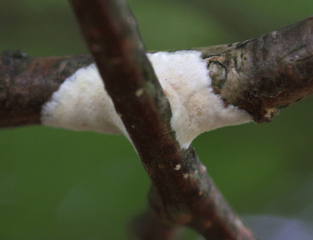 But at the end of July, I came across this: freshly grown glue fungus. Off-white, with a felty texture.